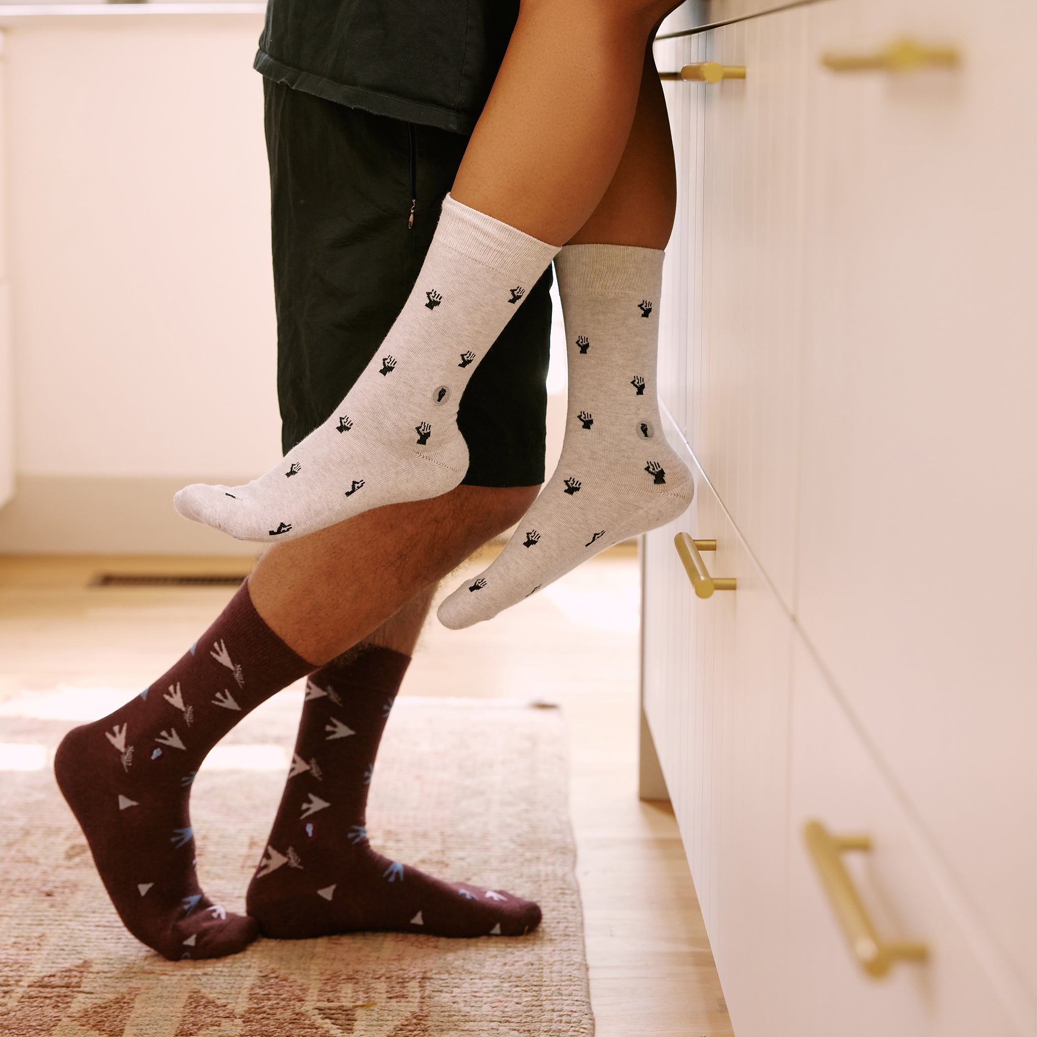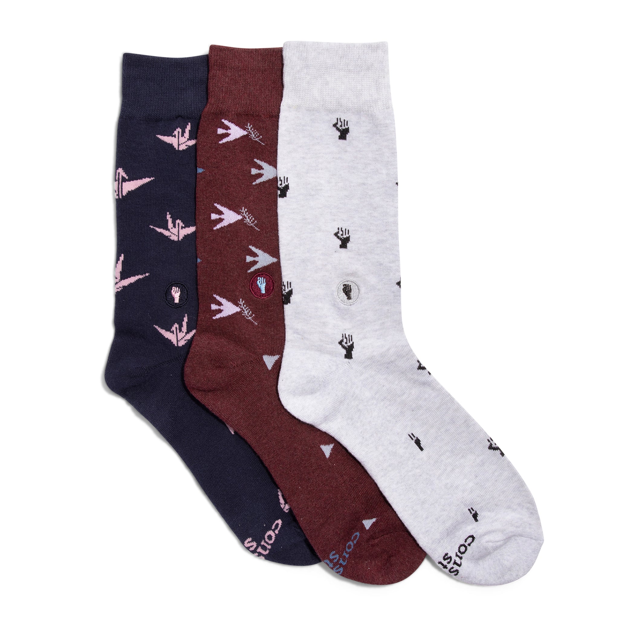 A gift box perfect for the activist in your life, these three Fairtrade, organic pairs inspired by peace and hope are just a few of the many (cozy) ways we can support equality for all. 3-pack gift box of recycled packaging, with cause insert Fairtrade, GOTS, and Vegan Certified Knit with combed cotton yarn for a smooth feel, greater durability, and reduced pilling Terry padding for comfort Machine wash cold. Do not Bleach. Tumble dry Low. Do not Iron. 75% Fairtrade Organic Cotton, 23% Recycled Polyester, 2% Elastane Made in India Fit for US Men’s Shoe Sizes: Small (4-8), Medium (8-13), Large (13+) Fit for US Women’s Shoe Sizes: Small (5-9), Medium (9-14), Large (14+) If you’re between sizes, size down for a tighter fit
