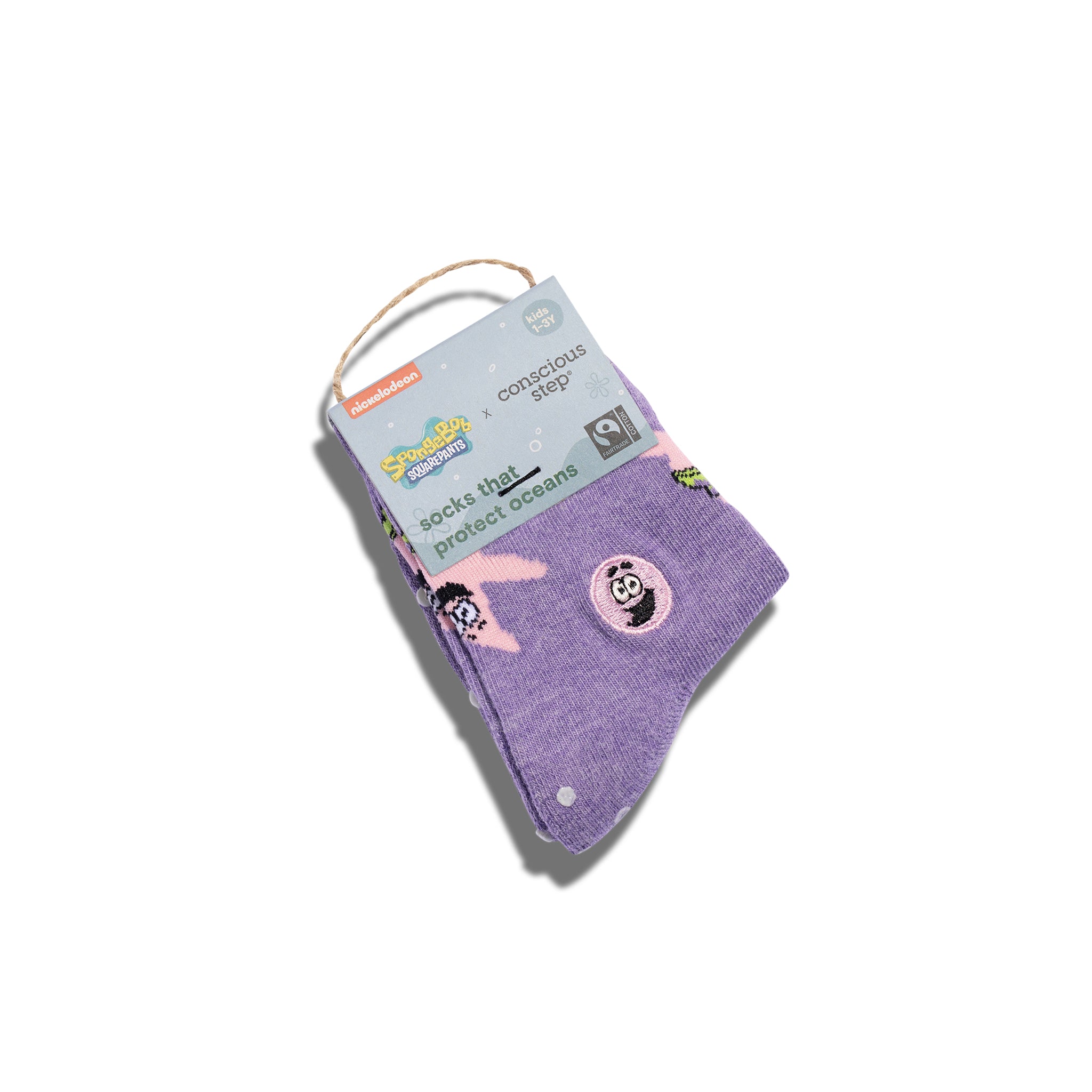 Patrick Star socks for those who have earned their good noodle star! Let them shine bright in and out of class with these peppy purple socks, featuring TV’s iconic starfish. Fairtrade and GOTS Certified* Knit with combed cotton yarn for a smooth feel, greater durability, and reduced pilling Terry padding for comfort Machine wash cold. Do not Bleach. Tumble dry Low. Do not Iron. 80% Fairtrade Organic Cotton, 18% Recycled Polyester, 2% Elastane Made in India Toddler size has silicone grippers for sliding *The silicone grippers used for our toddler pairs exclude them from the GOTS certification.