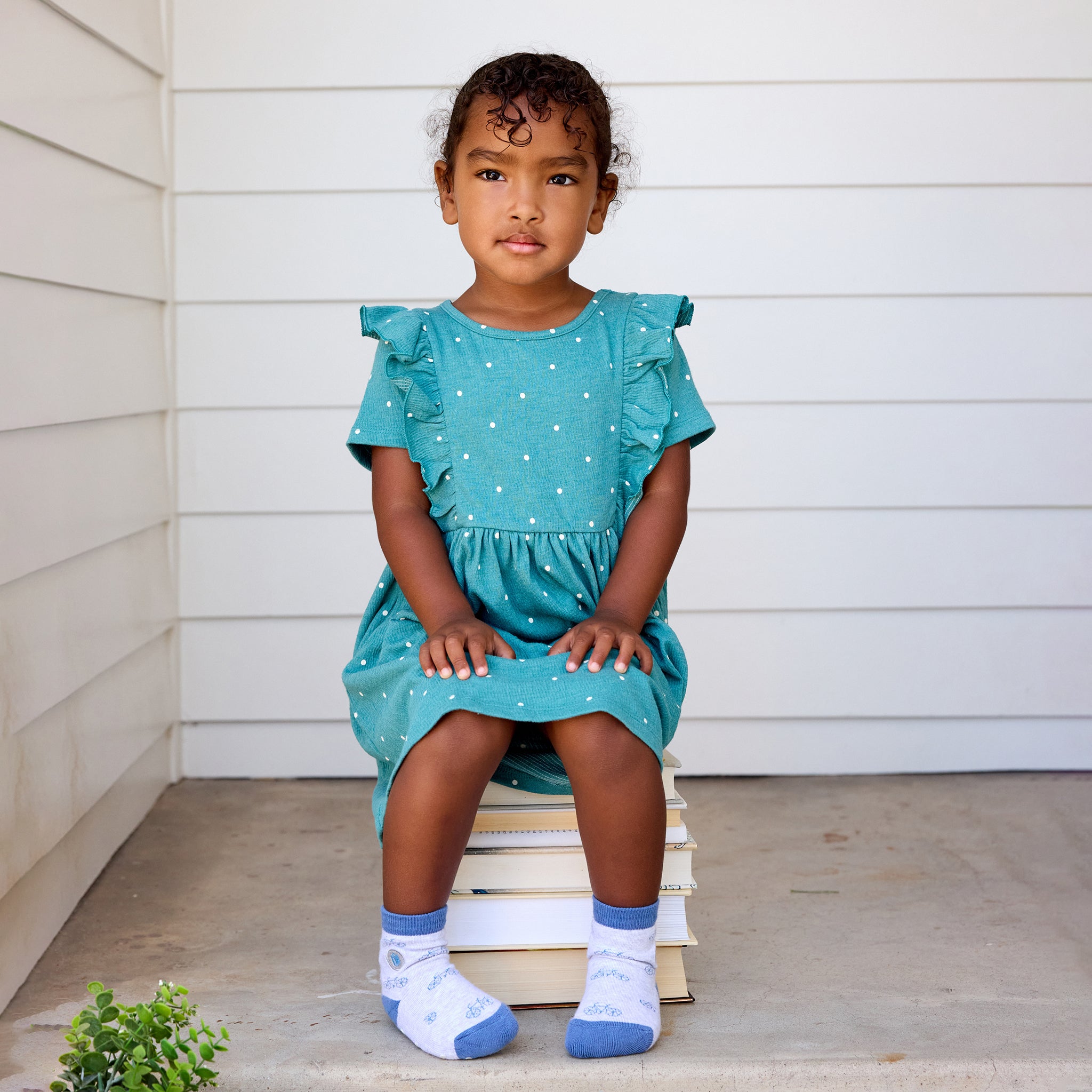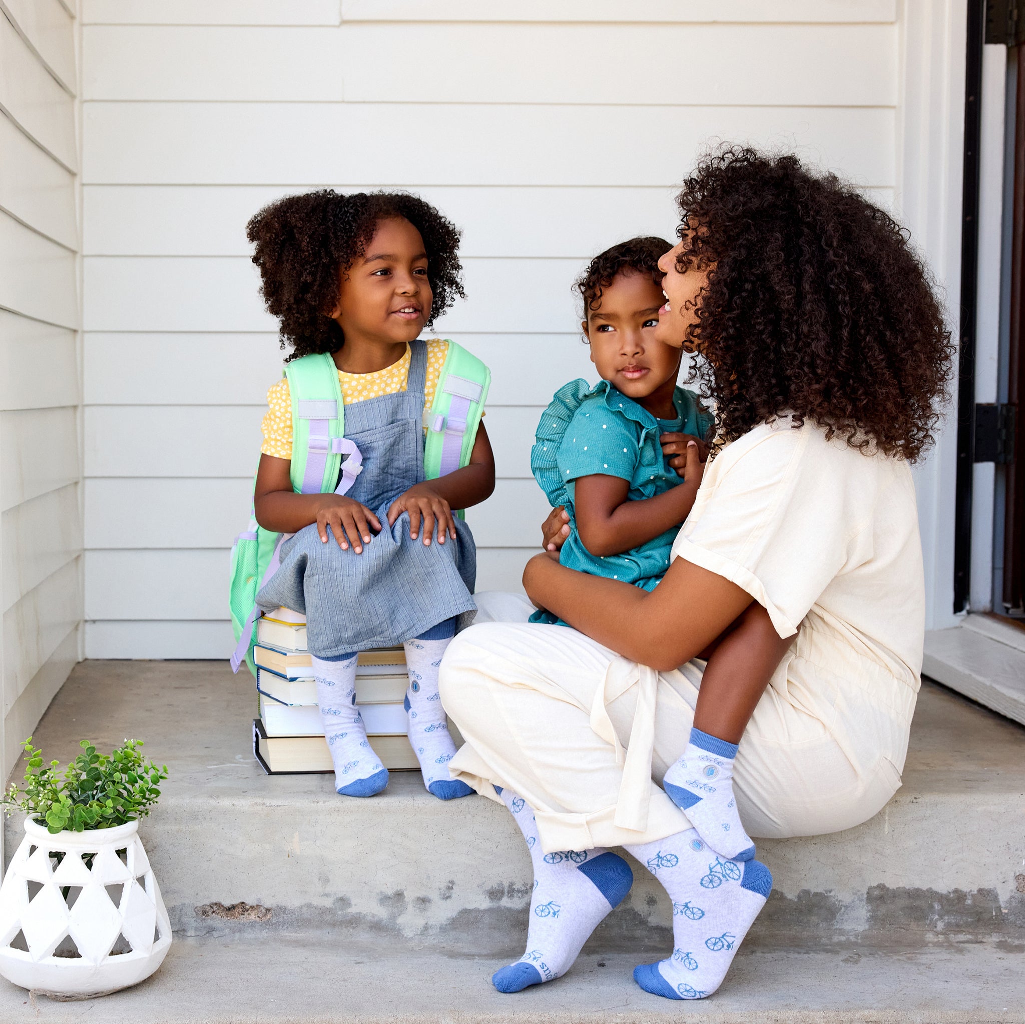 Socks for the bedtime story lovers! Now your bookworm can help little readers just like them with these fun, blue and gray bicycle-themed socks. Fairtrade and GOTS Certified* Knit with combed cotton yarn for a smooth feel, greater durability, and reduced pilling Terry padding for comfort Machine wash cold. Do not Bleach. Tumble dry Low. Do not Iron. 80% Fairtrade Organic Cotton, 18% Recycled Polyester, 2% Elastane Made in India Toddler size has silicone grippers for sliding *The silicone grippers used for our toddler pairs exclude them from the GOTS certification.