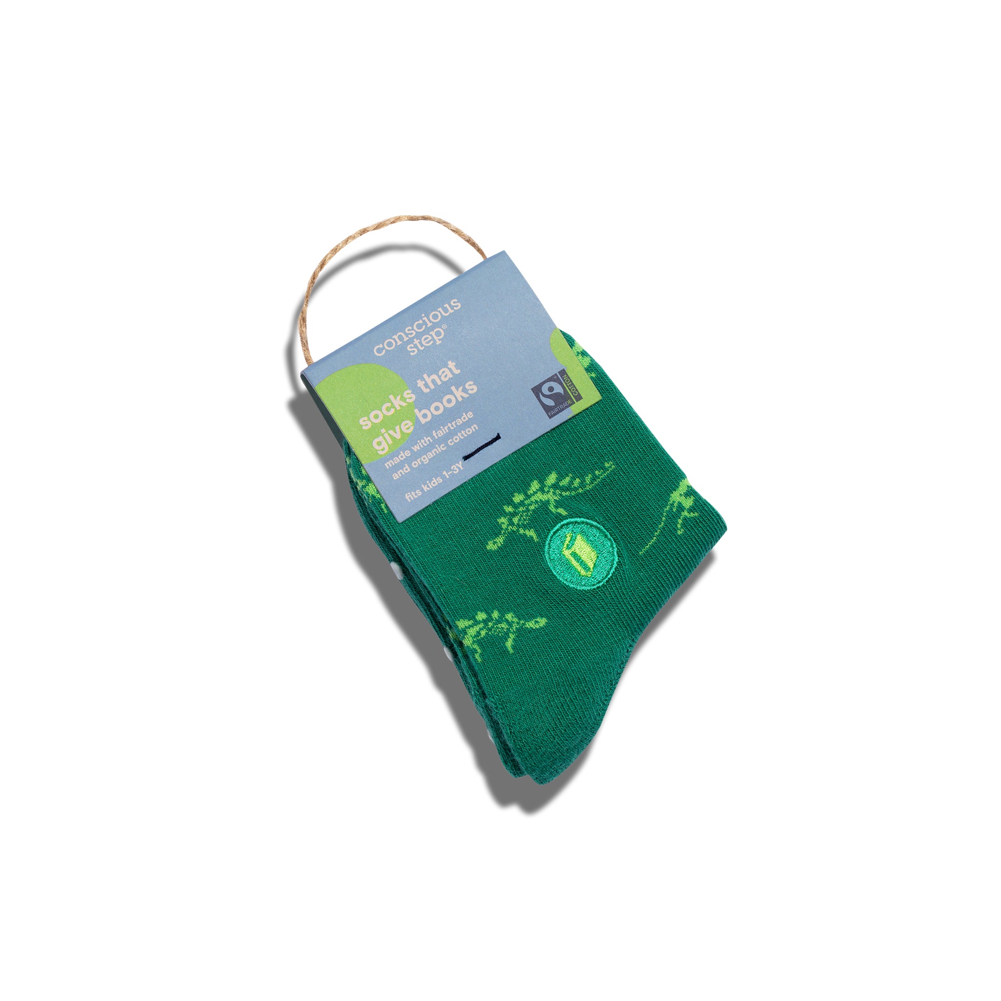 A dino-mite pair for your dino-obsessed kiddo! Shows them there’s always more to learn with this green pair with a dinosaur bones pattern. Fairtrade and GOTS Certified* Knit with combed cotton yarn for a smooth feel, greater durability, and reduced pilling Terry padding for comfort Machine wash cold. Do not Bleach. Tumble dry Low. Do not Iron. 75% Organic Cotton, 16% Recycled Polyester, 4% Recycled Polyamide, 3% Polyamide, 2% Elastane** Made in India Toddler size has silicone grippers for sliding *The silicone grippers used for our toddler pairs exclude them from the GOTS certification. **The composition of our socks has changed over time. You can always reference our packaging for the composition of your specific pair.