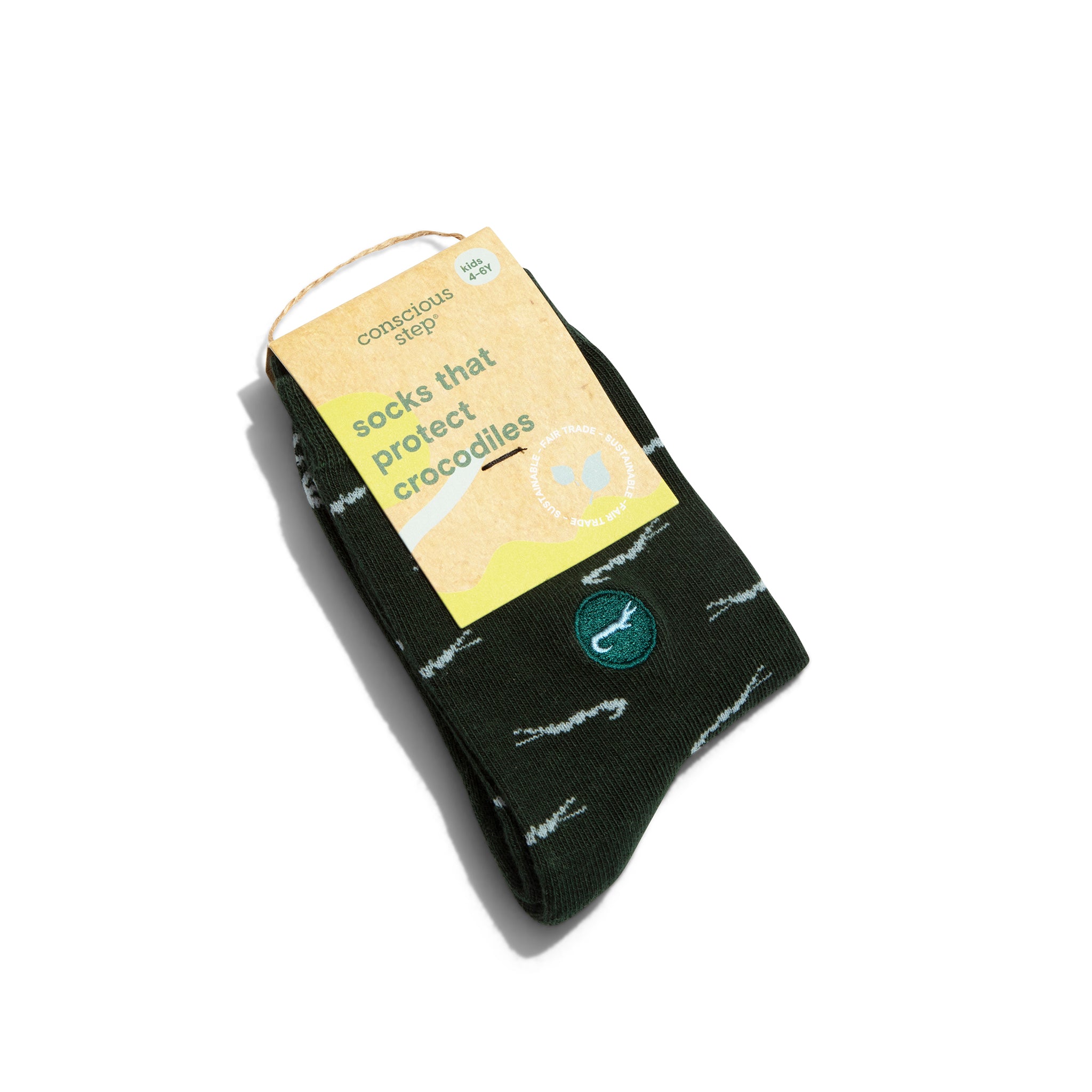 The next generation of reptile-lovers can now shed a crocodile tear of joy: we’ve got socks that protect crocodiles sized for your hatchlings! Fairtrade and GOTS Certified* Knit with combed cotton yarn for a smooth feel, greater durability, and reduced pilling Terry padding for comfort Machine wash cold. Do not Bleach. Tumble dry Low. Do not Iron. 75% Fairtrade Organic Cotton, 23% Recycled Polyester, 2% Elastane Made in India Toddler size has silicone grippers for sliding *The silicone grippers used for our toddler pairs exclude them from the GOTS certification.