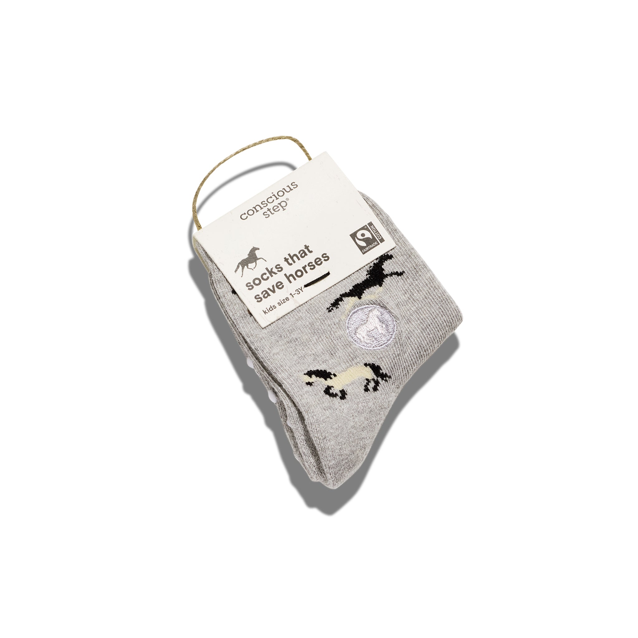 Giddy up! Designed with playful ponies and tons of comfort, these gray horse socks are perfect for kids who can’t get enough of their favorite foal friends. Fairtrade and GOTS Certified* Knit with combed cotton yarn for a smooth feel, greater durability, and reduced pilling Terry padding for comfort Machine wash cold. Do not Bleach. Tumble dry Low. Do not Iron. 70% Organic Cotton, 15% Recycled Polyester, 5% Recycled Polyamide, 8% Polyamide, 2% Elastane Made in India Toddler size has silicone grippers for sliding *The silicone grippers used for our toddler pairs exclude them from the GOTS certification.