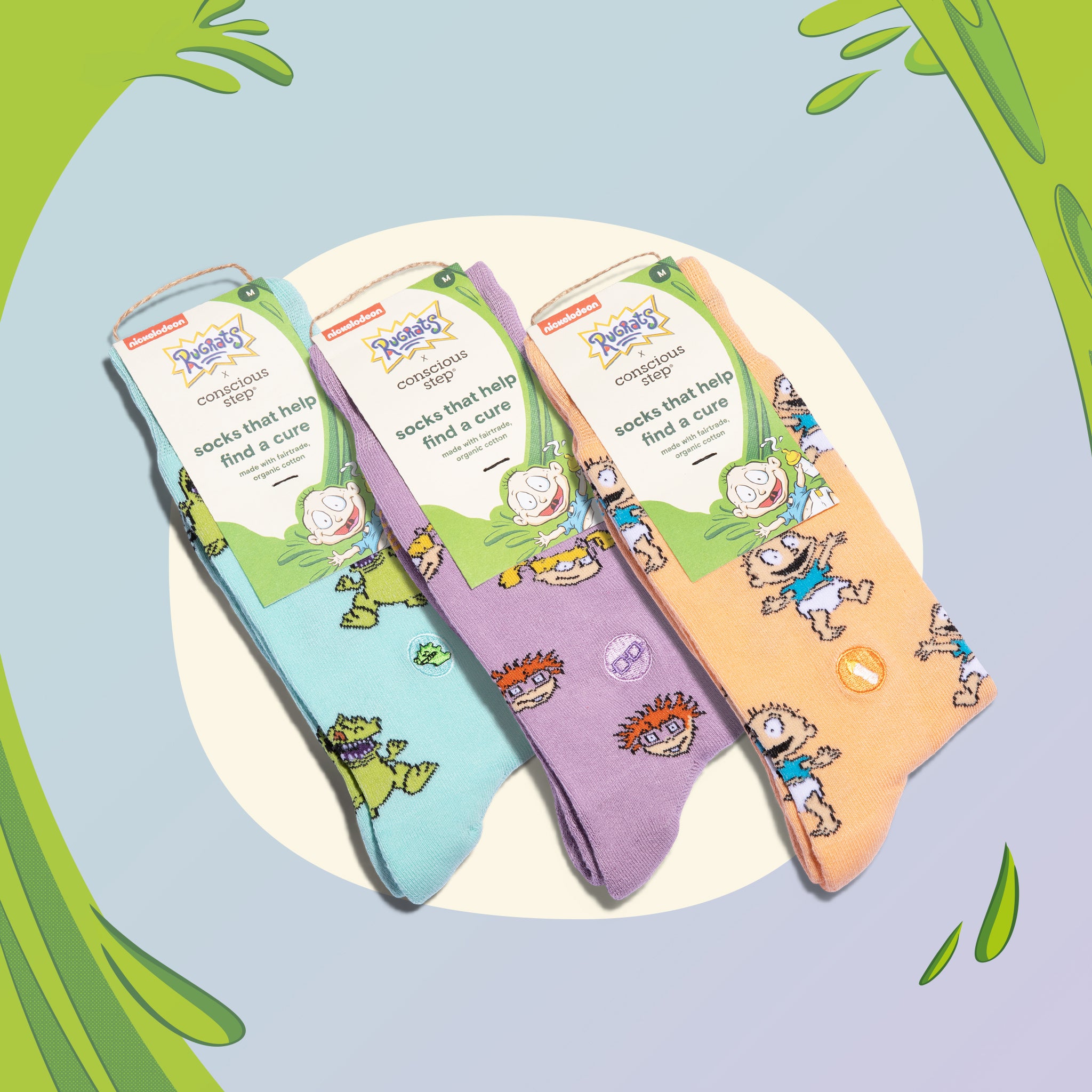 Step into nostalgia with our Rugrats-themed sock bundle, a playful tribute to the babies that taught us to embrace curiosity, courage, and a bit of mischief! Includes 3 single pairs Fairtrade, GOTS, and Vegan Certified Knit with combed cotton yarn for a smooth feel, greater durability, and reduced pilling Terry padding for comfort Machine wash cold. Do not Bleach. Tumble dry Low. Do not Iron. 80% Fairtrade Organic Cotton, 18% Recycled Polyester, 2% Elastane Made in India Fit for US Men’s Shoe Sizes: Small (4-8), Medium (8-13), Large (13+) Fit for US Women’s Shoe Sizes: Small (5-9), Medium (9-14), Large (14+) If you’re between sizes, size down for a tighter fit