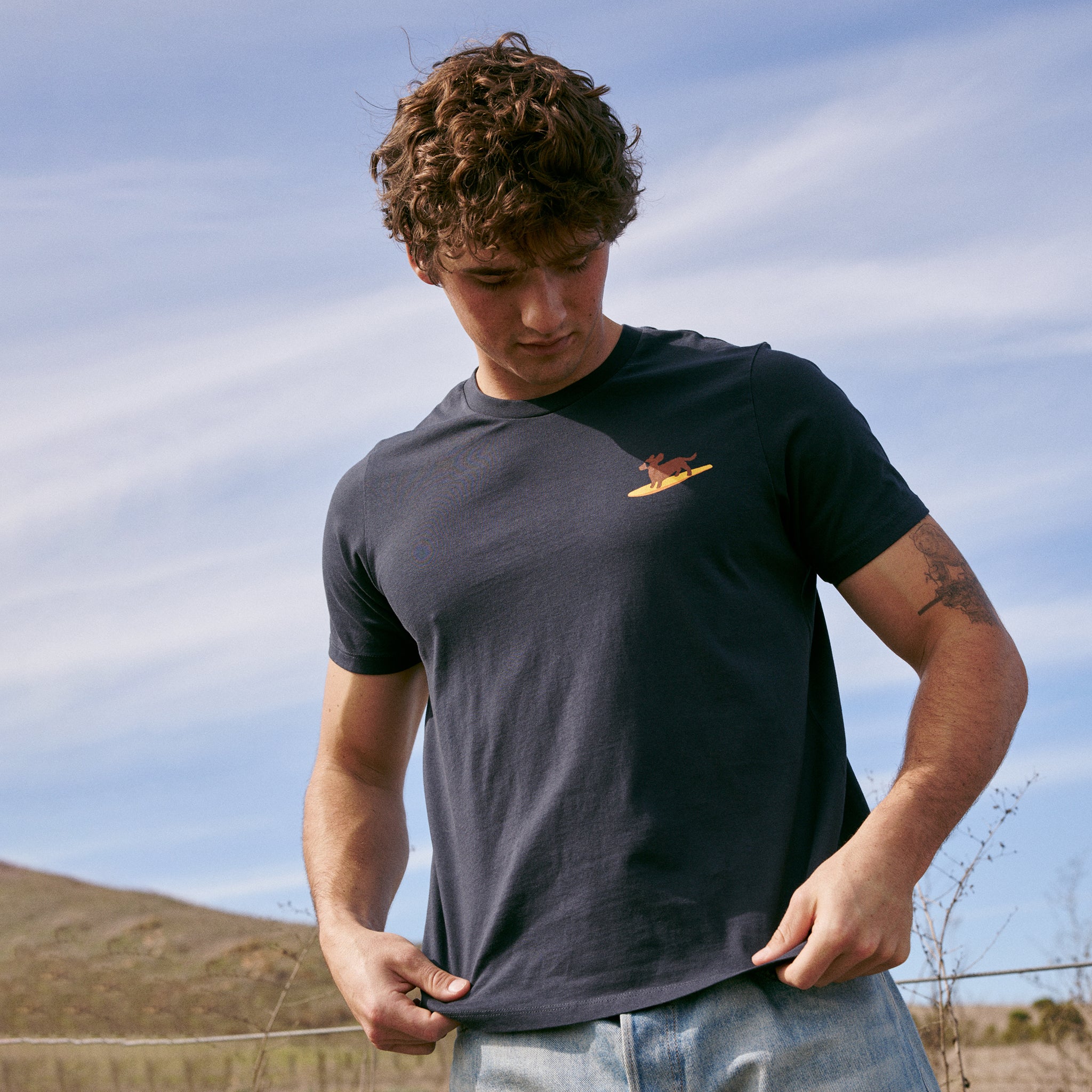 Surf’s pup! Catch some gnarly waves and some wag-worthy looks in this gray organic cotton surfing dog t-shirt; perfect for those who live life with a bit of salt in the air and fur on their clothes. Drue is 6’1″ and weighs 160 lbs and is wearing size large Bridget is 6’0″and weighs 145 lbs and is wearing size small Our unisex design features a smooth and relaxed fit, offering comfortable style for everyone. Machine wash cold with like colors, tumble dry with low heat. Cool iron when needed. 100% Fairtrade and GOTS certified organic cotton that was grown and harvested close to our factory in India, and dyed with non-toxic dyes. Made in India in a factory that uses renewable energy and recycles all water used during production.