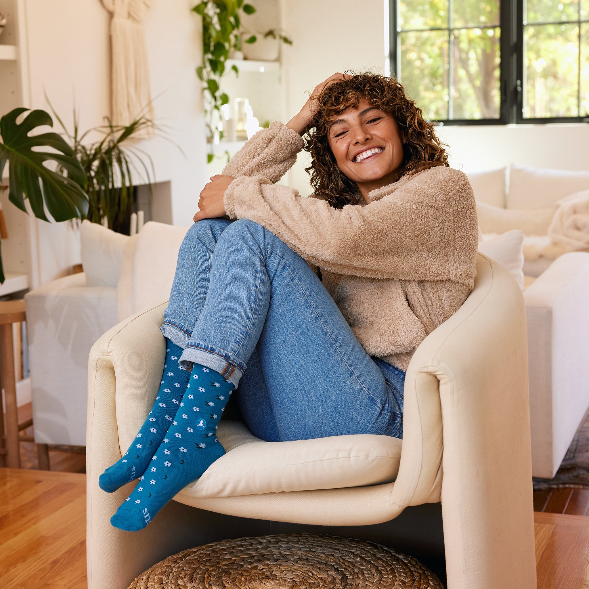These flowers are helping others grow! And who doesn’t love getting a bouquet every once in a while? This tiny wildflower pattern has a big mission behind it; to get kids back to their wild selves. Fairtrade, GOTS, and Vegan Certified Knit with combed cotton yarn for a smooth feel, greater durability, and reduced pilling Terry padding for comfort Machine wash cold. Do not Bleach. Tumble dry Low. Do not Iron. 75% Fairtrade Organic Cotton, 23% Recycled Polyester, 2% Elastane Made in India Fit for US Men’s Shoe Sizes: Small (4-8), Medium (8-13), Large (13+) Fit for US Women’s Shoe Sizes: Small (5-9), Medium (9-14), Large (14+) If you’re between sizes, size down for a tighter fit