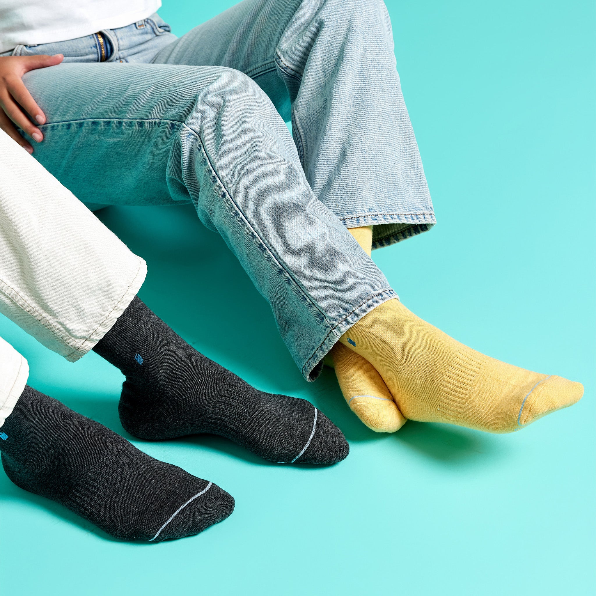 Cozy up with a good book, and socks to match! This box was made for page-turners, coffee shop lovers, library card owners, or anyone else who wants to help children build a brighter future through learning. This 3-pack of crew socks in charcoal, mustard, and gray with a book embroidery helps provide children with the educational tools they need to thrive through our partnership with Room to Read. Conscious Comfort socks are made from extra soft Fairtrade organic cotton and are designed with banded arch support and padding for supreme comfort. Fairtrade, GOTS, and Vegan Certified Knit with combed cotton yarn for a smooth feel, greater durability, and reduced pilling Terry padding for comfort Machine wash cold. Do not Bleach. Tumble dry Low. Do not Iron. 80% Fairtrade Organic Cotton, 18% Recycled Polyester, 2% Elastane Made in India Fit for US Men’s Shoe Sizes: Small (4-8), Medium (8-13), Large (13+) Fit for US Women’s Shoe Sizes: Small (5-9), Medium (9-14), Large (14+) If you’re between sizes, size down for a tighter fit
