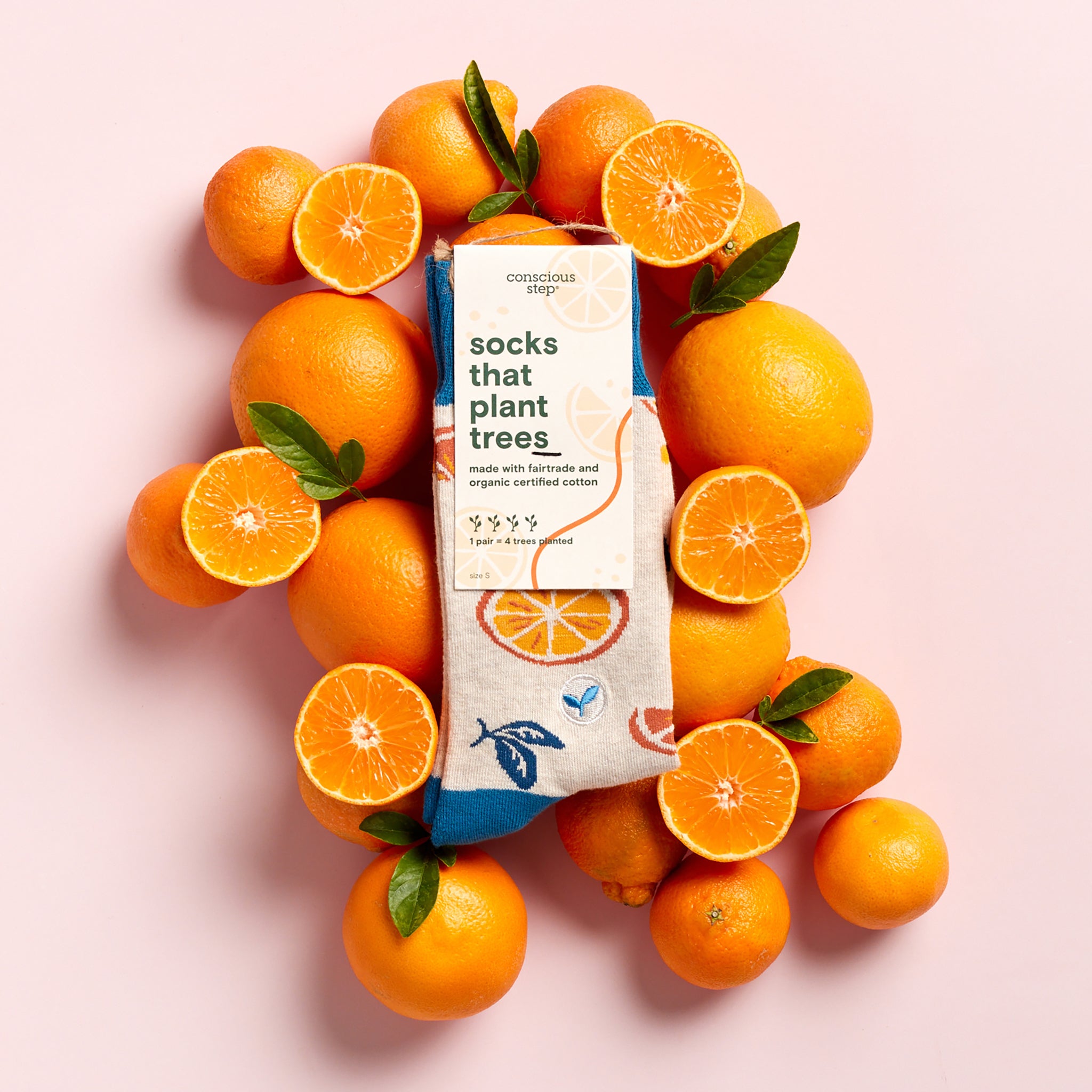 Orange these socks the greatest? Embellished with dark leaves and juicy oranges, this cream and blue pair does it all: keeps your toes warm, brightens all outfits, & plants trees with each purchase! Fairtrade, GOTS, and Vegan Certified Knit with combed cotton yarn for a smooth feel, greater durability, and reduced pilling Terry padding for comfort Machine wash cold. Do not Bleach. Tumble dry Low. Do not Iron. 70% Organic Cotton, 15% Recycled Polyester, 5% Recycled Polyamide, 8% Polyamide, 2% Elastane* Made in India Fit for US Men’s Shoe Sizes: Small (4-8), Medium (8-13), Large (13+) Fit for US Women’s Shoe Sizes: Small (5-9), Medium (9-14), Large (14+) If you’re between sizes, size down for a tighter fit *The composition of our socks has changed over time. You can always reference our packaging for the composition of your specific pair.