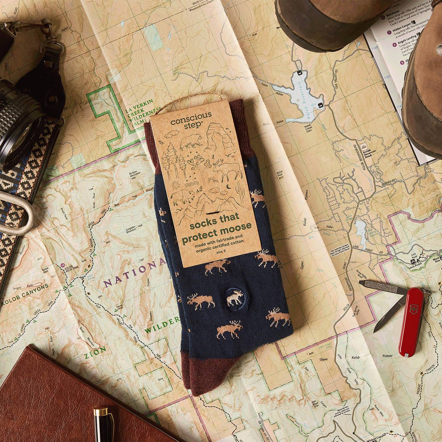 We herd you’re the outdoorsy type… so step out in style in this navy and maroon moose pair and hit the trails, just like our northern moose friends! Fairtrade, GOTS, and Vegan Certified Knit with combed cotton yarn for a smooth feel, greater durability, and reduced pilling Terry padding for comfort Machine wash cold. Do not Bleach. Tumble dry Low. Do not Iron. 75% Organic Cotton, 16% Recycled Polyester, 4% Recycled Polyamide, 3% Polyamide, 2% Elastane* Made in India Fit for US Men’s Shoe Sizes: Small (4-8), Medium (8-13), Large (13+) Fit for US Women’s Shoe Sizes: Small (5-9), Medium (9-14), Large (14+) If you’re between sizes, size down for a tighter fit *The composition of our socks has changed over time. You can always reference our packaging for the composition of your specific pair.