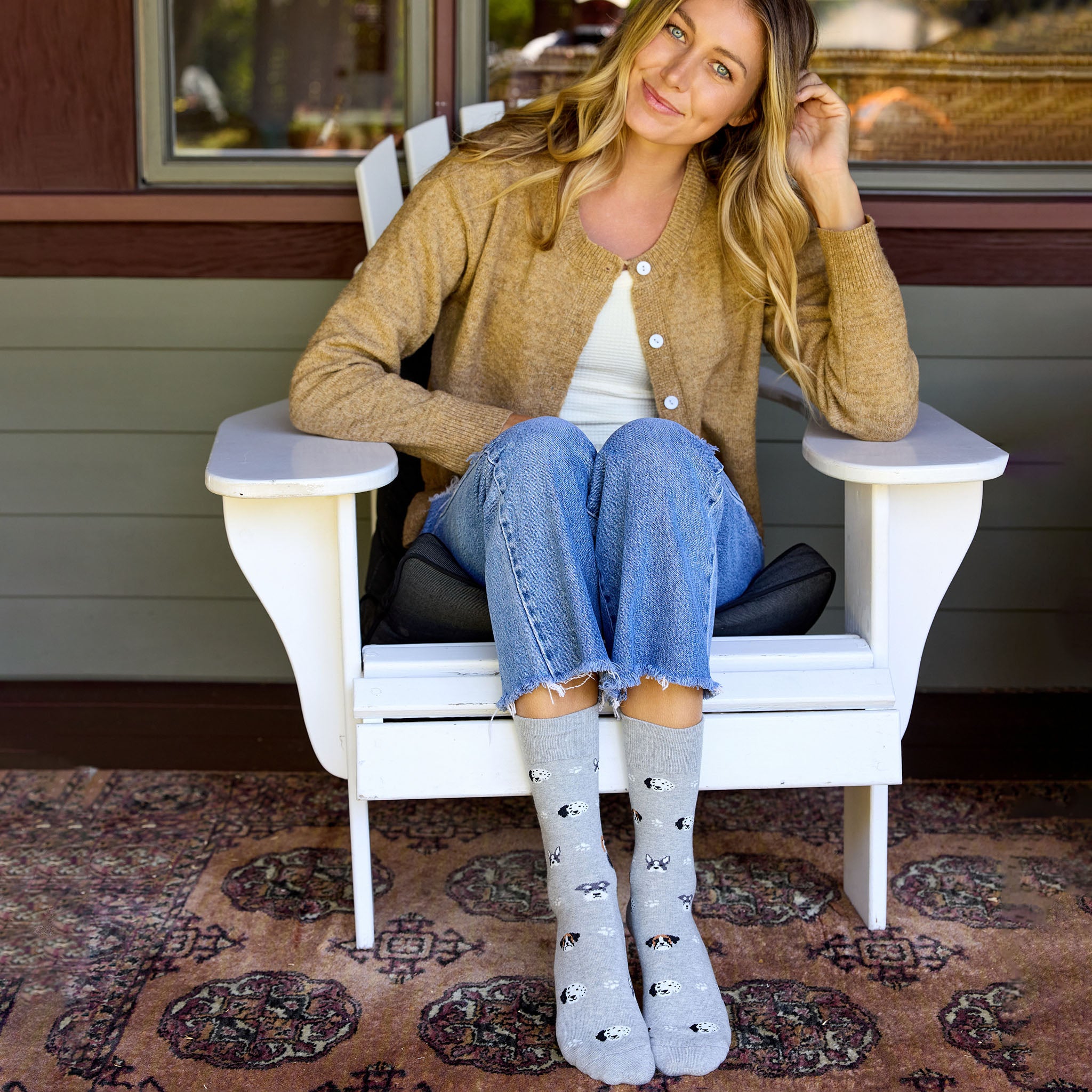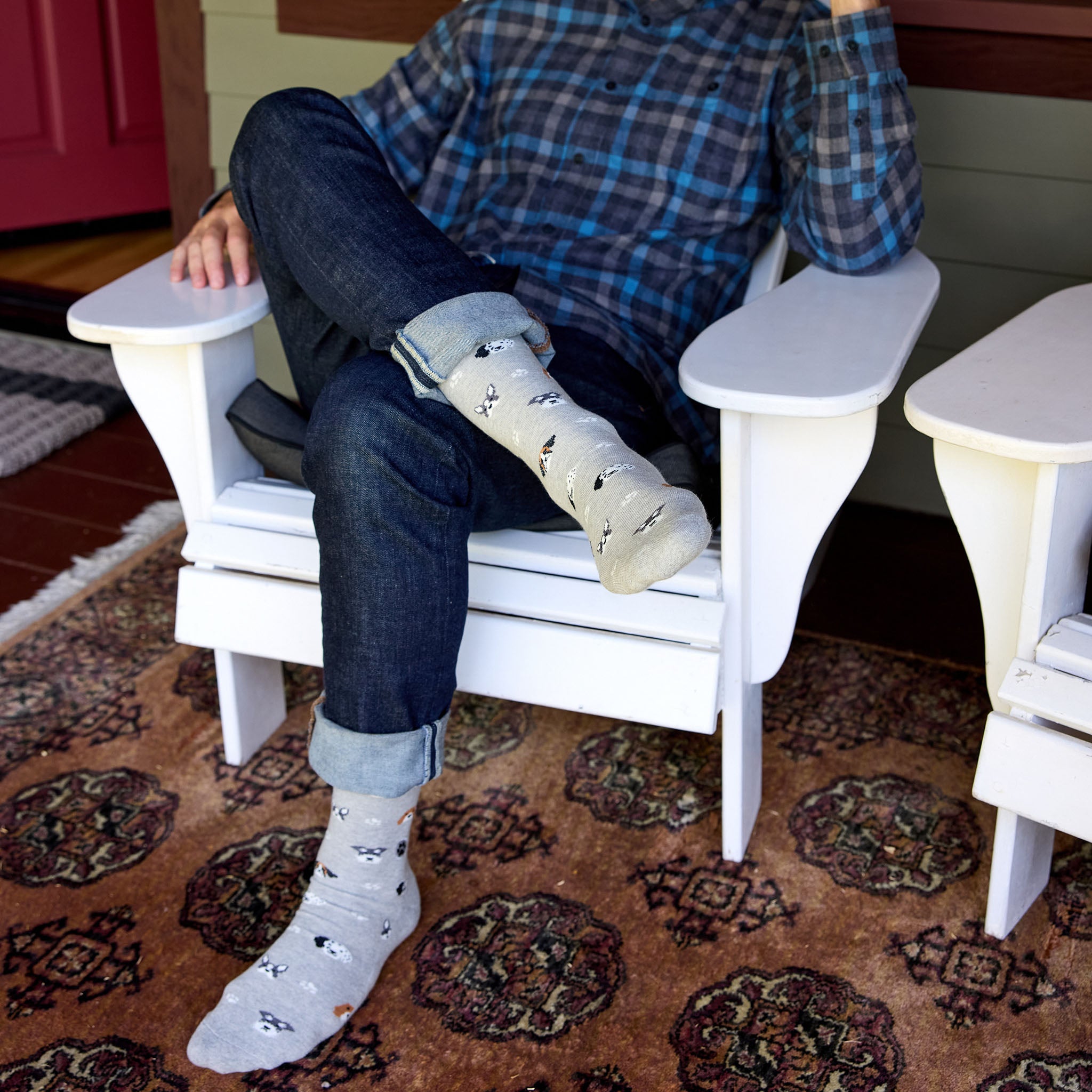 Who can resist those puppy dog eyes?! Certainly not us. Say yes to treats and extra walks with this gray pair featuring beagles, boxers, dalmatians, schnauzers, and Boston terriers. Fairtrade, GOTS, and Vegan Certified Knit with combed cotton yarn for a smooth feel, greater durability, and reduced pilling Terry padding for comfort Machine wash cold. Do not Bleach. Tumble dry Low. Do not Iron. 70% Organic Cotton, 15% Recycled Polyester, 5% Recycled Polyamide, 8% Polyamide, 2% Elastane* Made in India Fit for US Men’s Shoe Sizes: Small (4-8), Medium (8-13), Large (13+) Fit for US Women’s Shoe Sizes: Small (5-9), Medium (9-14), Large (14+) If you’re between sizes, size down for a tighter fit *The composition of our socks has changed over time. You can always reference our packaging for the composition of your specific pair.