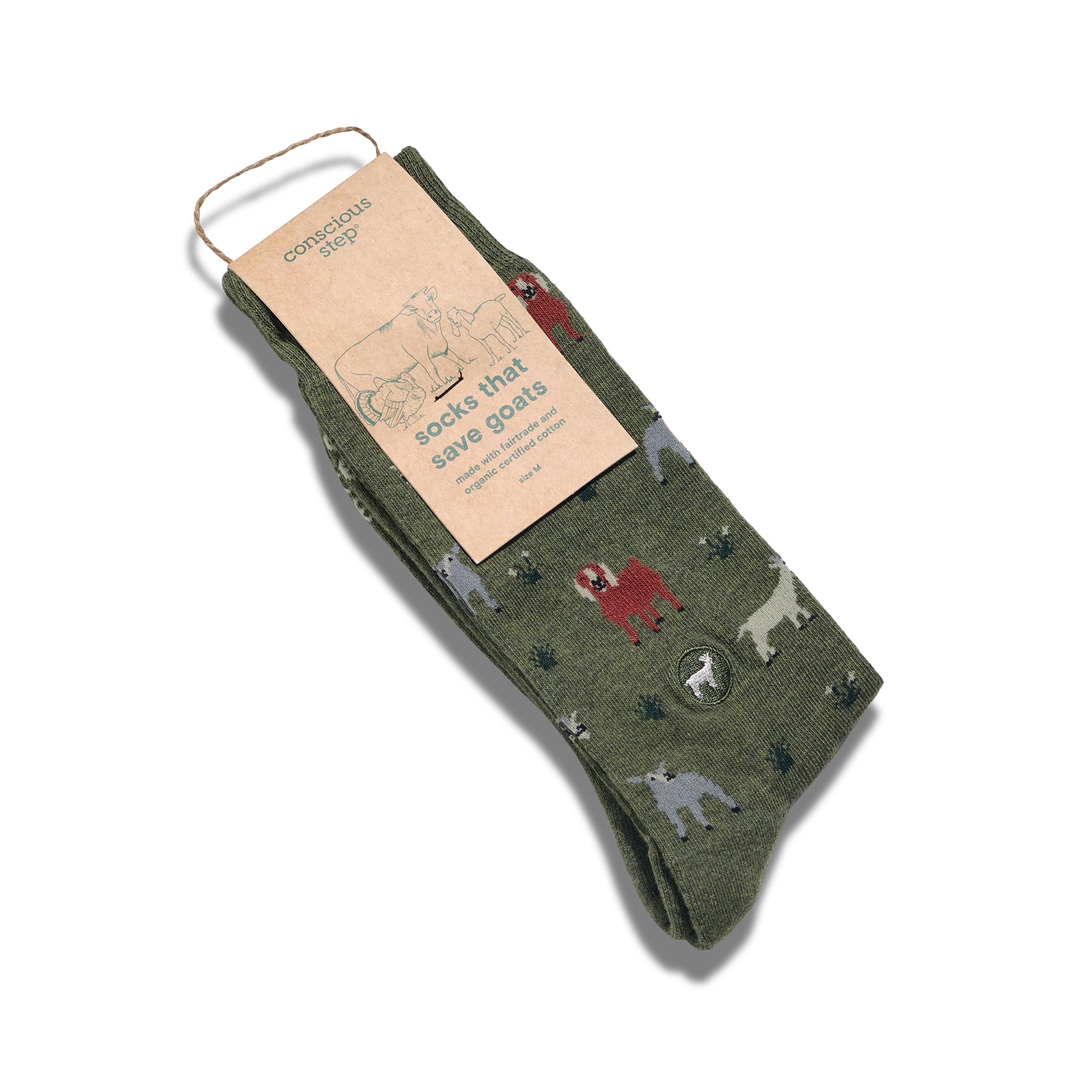 These olive green goat socks might be our greatest of all time. Featuring curious grazing goats, it’s a style that others in your sock drawer might be hard to bleat. Fairtrade, GOTS, and Vegan Certified Knit with combed cotton yarn for a smooth feel, greater durability, and reduced pilling Terry padding for comfort Machine wash cold. Do not Bleach. Tumble dry Low. Do not Iron. 70% Organic Cotton, 15% Recycled Polyester, 5% Recycled Polyamide, 8% Polyamide, 2% Elastane Made in India Fit for US Men’s Shoe Sizes: Small (4-8), Medium (8-13), Large (13+) Fit for US Women’s Shoe Sizes: Small (5-9), Medium (9-14), Large (14+) If you’re between sizes, size down for a tighter fit