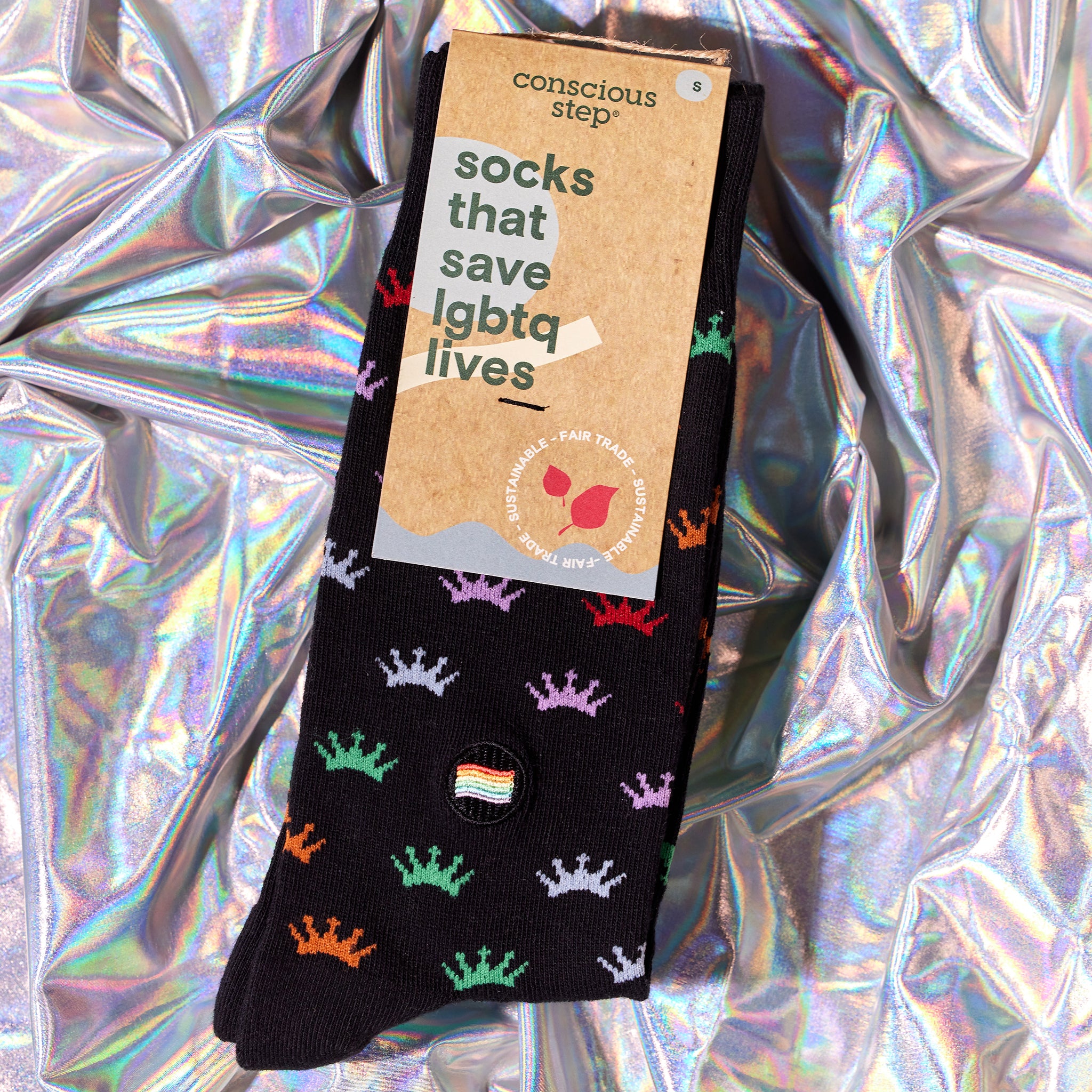 Hold your head up high and wear your crown with pride! If you’re unapologetically yourself, this black pair is for you. Let this royalty-inspired pair remind you of your worth with every step. Fairtrade, GOTS, and Vegan Certified Knit with combed cotton yarn for a smooth feel, greater durability, and reduced pilling Terry padding for comfort Machine wash cold. Do not Bleach. Tumble dry Low. Do not Iron. 75% Fairtrade Organic Cotton, 23% Recycled Polyester, 2% Elastane Made in India Fit for US Men’s Shoe Sizes: Small (4-8), Medium (8-13), Large (13+) Fit for US Women’s Shoe Sizes: Small (5-9), Medium (9-14), Large (14+) If you’re between sizes, size down for a tighter fit