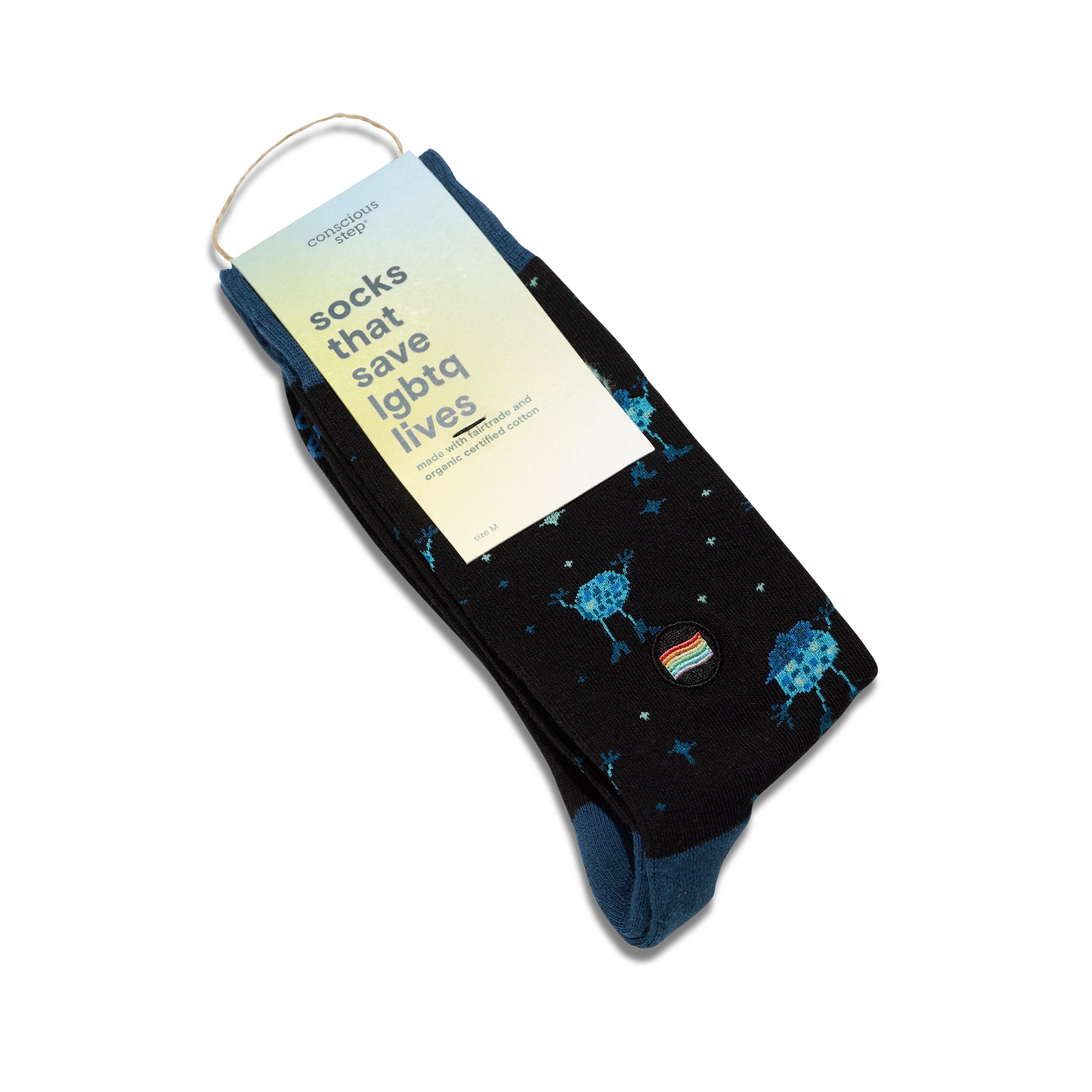 Take every step with pride in these rainbow LGBTQ socks! Bursting with rainbow colors, this pair makes any day a celebration of love, inclusion, and unity. Fairtrade, GOTS, and Vegan Certified Knit with combed cotton yarn for a smooth feel, greater durability, and reduced pilling Terry padding for comfort Machine wash cold. Do not Bleach. Tumble dry Low. Do not Iron. 75% Organic Cotton, 16% Recycled Polyester, 4% Recycled Polyamide, 3% Polyamide, 2% Elastane Made in India Fit for US Men’s Shoe Sizes: Small (4-8), Medium (8-13), Large (13+) Fit for US Women’s Shoe Sizes: Small (5-9), Medium (9-14), Large (14+) If you’re between sizes, size down for a tighter fit