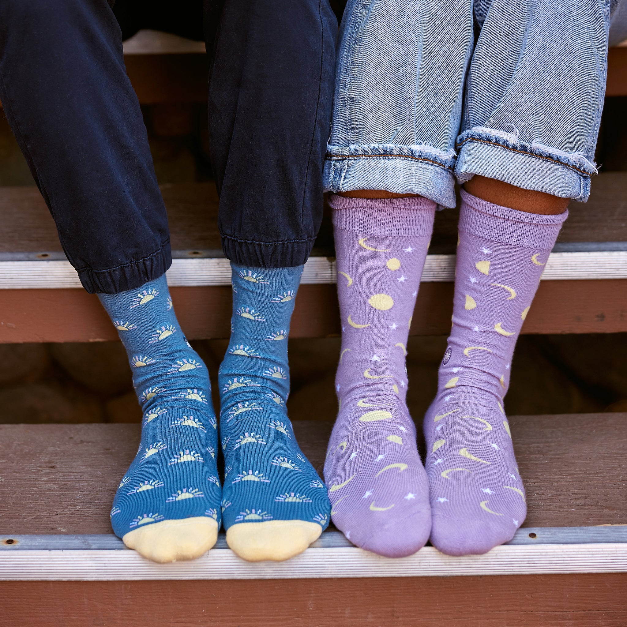 Take to the skies with this celestial-inspired bundle of socks that support mental health! Let these cozy pairs in relaxing hues inspire you to make some time for rest and relaxation. Just imagine stepping out of a hot, candle-lit bath and cozying up in your favorite pajamas and these pairs. Thanks to this box, you can give that experience to anyone on your list (or even yourself). 3-pack gift box of recycled packaging, with cause insert Fairtrade, GOTS, and Vegan Certified Knit with combed cotton yarn for a smooth feel, greater durability, and reduced pilling Terry padding for comfort Machine wash cold. Do not Bleach. Tumble dry Low. Do not Iron. 75% Fairtrade Organic Cotton, 23% Recycled Polyester, 2% Elastane Made in India Fit for US Men’s Shoe Sizes: Small (4-8), Medium (8-13), Large (13+) Fit for US Women’s Shoe Sizes: Small (5-9), Medium (9-14), Large (14+) If you’re between sizes, size down for a tighter fit